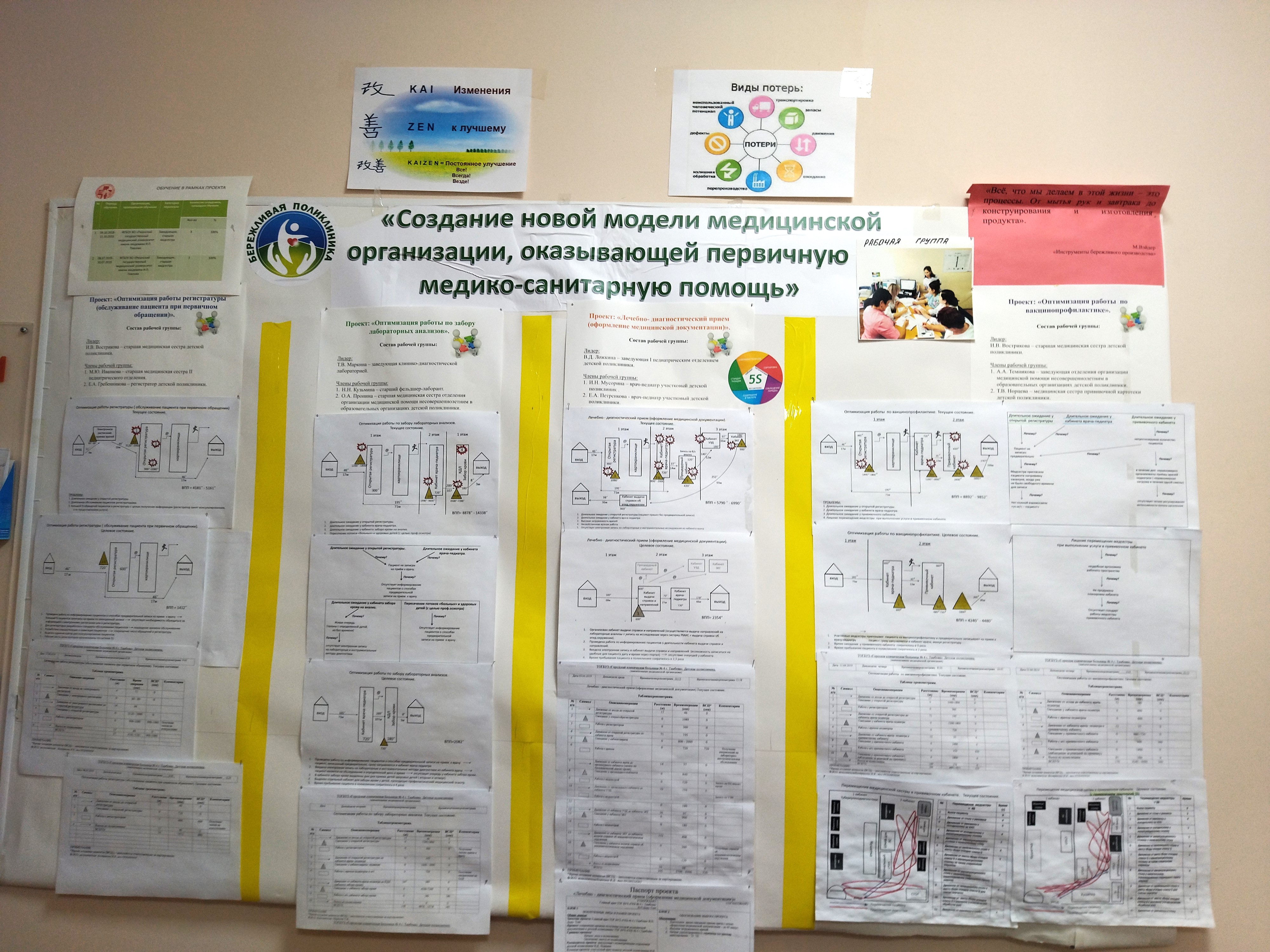 В ТОГБУЗ «ГКБ № 4 г. Тамбова» продолжается реализация проекта «Создание новой модели медицинской организации, оказывающей первичную медико — санитарную помощь» с применением технологий бережливого производства. В настоящее время идёт работа по улучшению направлений: