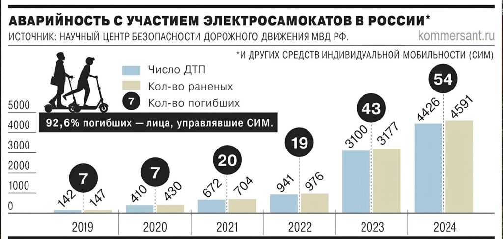 - В 2024 году произошло 4,42 тыс. ДТП с участием СИМ, в которых погибли 54 человека.