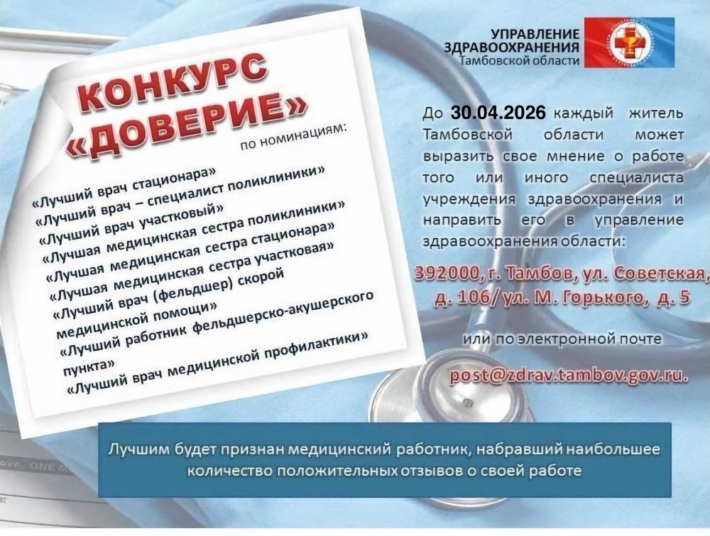 До 30.04.2026 каждый житель Тамбовской области может выразить свое мнение о работе того или иного специалиста учреждения здравоохранения и направить его в управление здравоохранения области