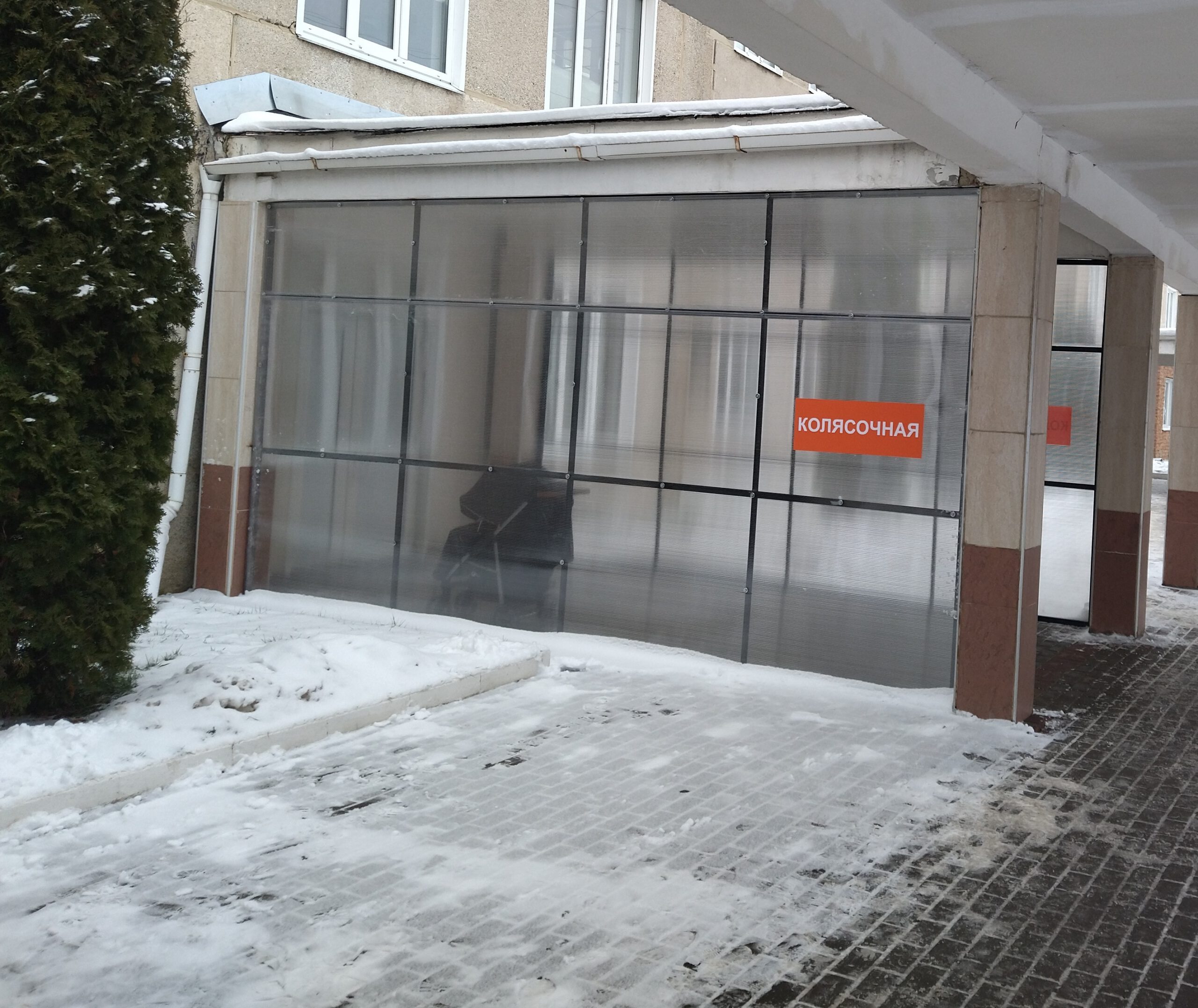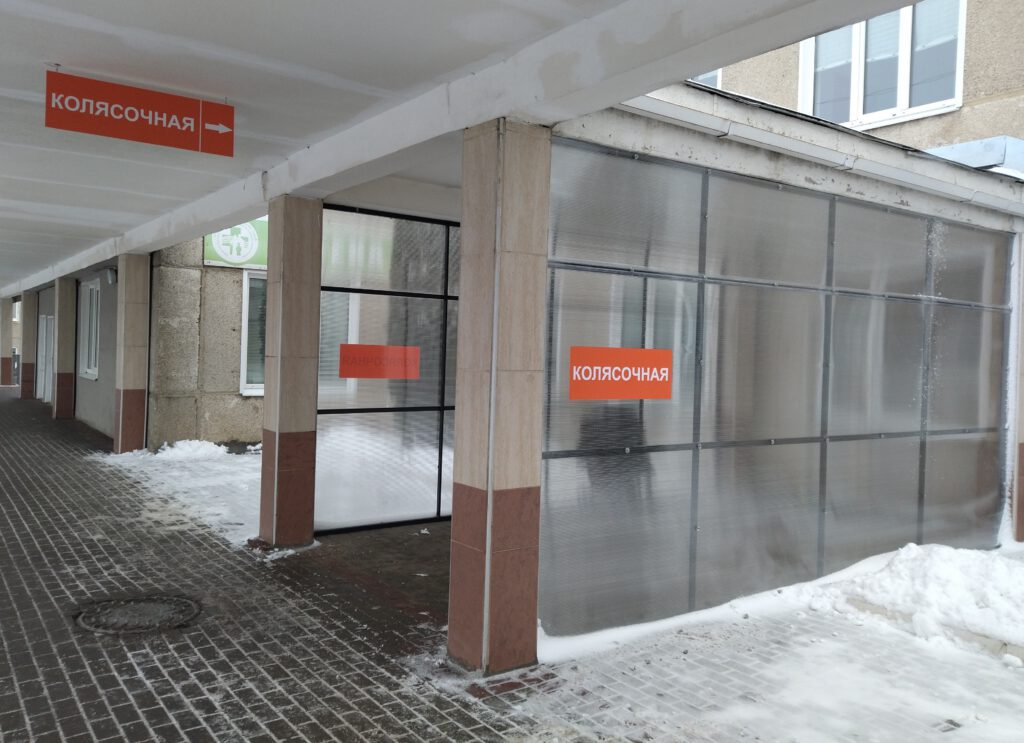 У детской поликлиники ТОГБУЗ «Городская клиническая больница №4 г.Тамбова» организована крытая колясочная зона для стоянки детских колясок.